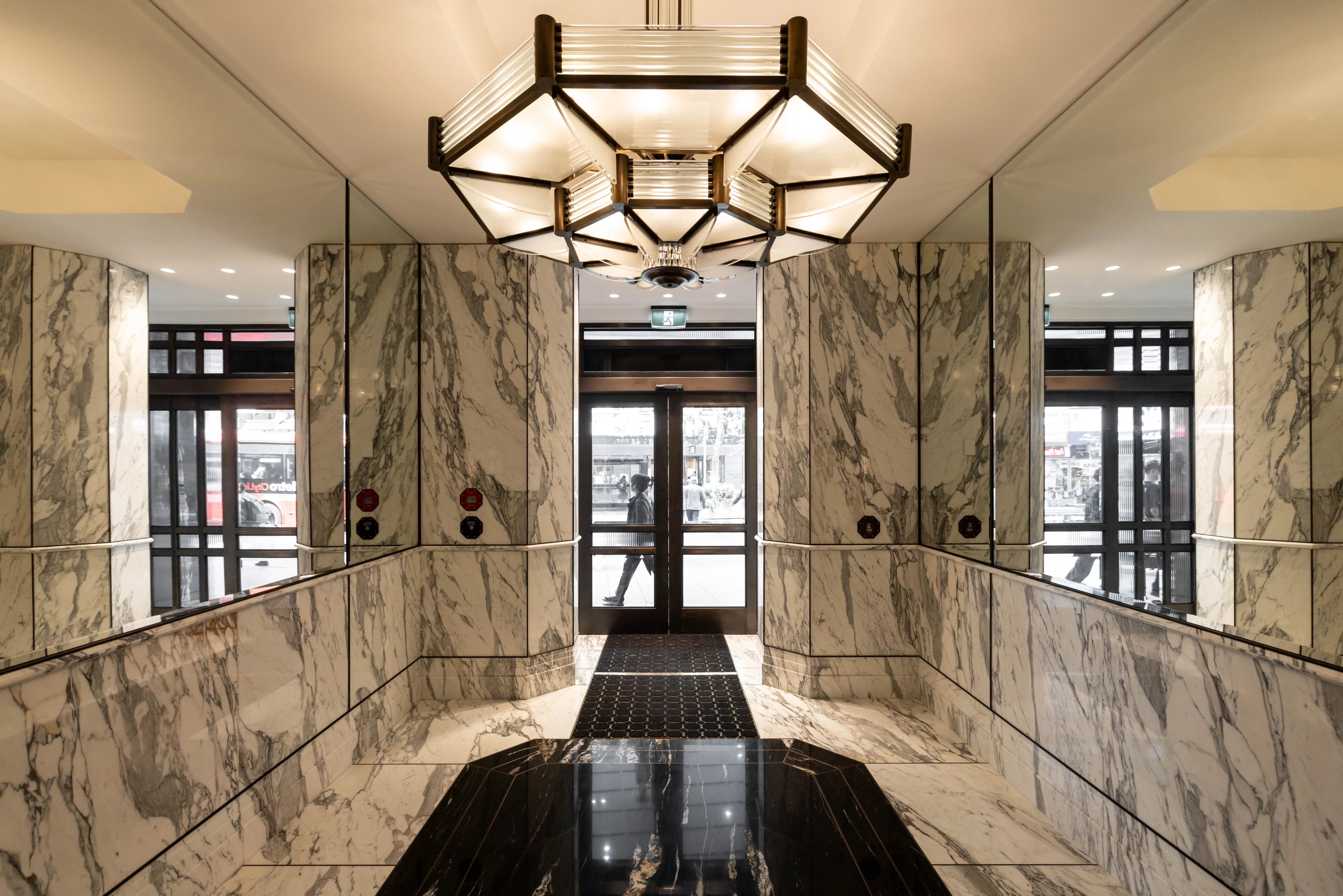 The upper levels have been converted into luxury offices and a hospitality precinct, with the entrance lobby standing out as a defining feature of the development.